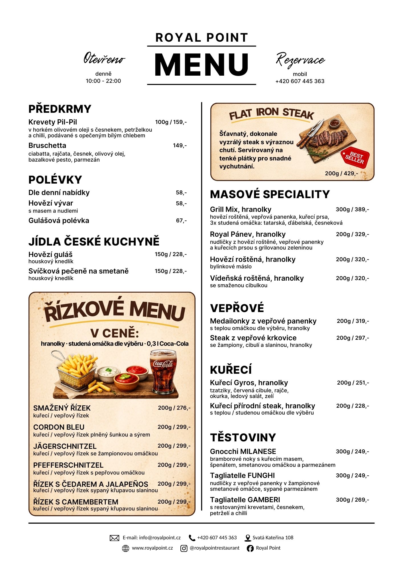 Nabízíme moderní českou kuchyni se zaměřením na lokální a sezónní receptury. Skladba jídelního lístku vychází vstříc každému zákazníkovi. V naší restauraci si pochutnají příznivci tradiční české kuchyně, děti ale také nároční zákazníci milující hovězí steaky a jiné speciality.